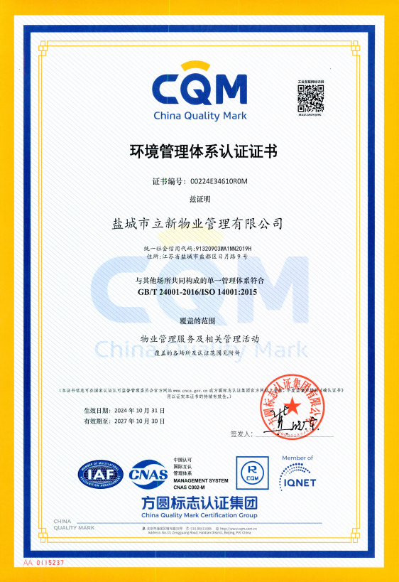 近日,鹽城市立新物業(yè)管理有限公司傳來喜訊,經(jīng)過三個(gè)月的精心籌備與不懈努力,立新物業(yè)公司順利通過了質(zhì)量管理體系ISO9001、環(huán)境管理體系ISO14001、職業(yè)健康安全管理體系ISO45001資質(zhì)認(rèn)證。
